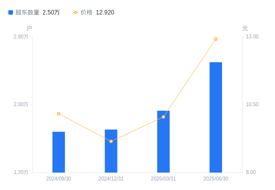 近一年(2024年6月30日至2025年6月30日),百合花A股股东户数从1.73万户,增加至2.5万户,增幅44.80%,区间股价上涨35.71%。