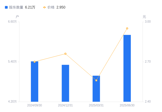 近一年(2024年6月30日至2025年6月30日),华电辽能A股股东户数从5.17万户,增加至6.21万户,增幅20.11%,区间股价上涨8.86%。
