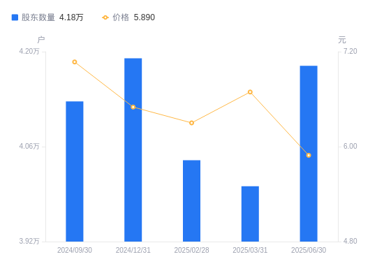 近一年(2024年6月30日至2025年6月30日),开滦股份A股股东户数从3.97万户,增加至4.18万户,增幅5.16%,区间股价下跌10.76%。