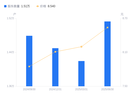 近一年(2024年6月30日至2025年6月30日),九牧王A股股东户数从1.4万户,增加至1.51万户,增幅8.04%,区间股价上涨5.17%。