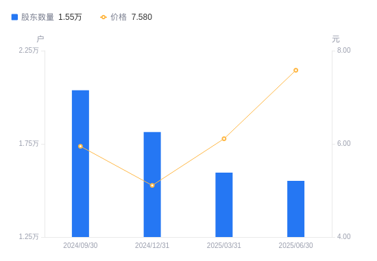 近一年(2024年6月30日至2025年6月30日),海伦钢琴A股股东户数从1.93万户,减低至1.55万户,降幅19.67%,区间股价上涨102.78%。