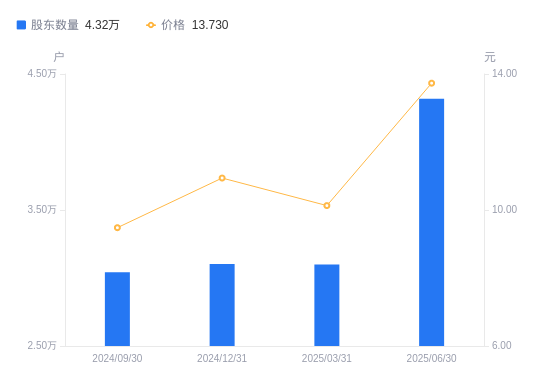 近一年(2024年6月30日至2025年6月30日),通达电气A股股东户数从3.7万户,增加至4.32万户,增幅16.67%,区间股价上涨64.04%。