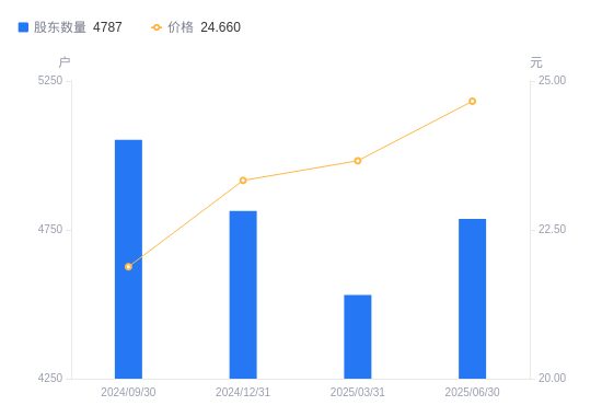 近一年(2024年6月30日至2025年6月30日),倍加洁A股股东户数从5497户,减低至4787户,降幅12.92%,区间股价上涨26.20%。