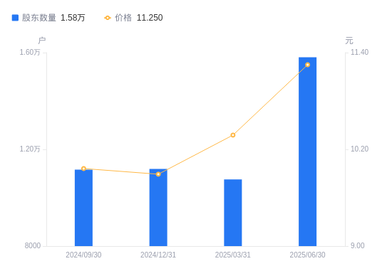 近一年(2024年6月30日至2025年6月30日),上海雅仕A股股东户数从1.14万户,增加至1.58万户,增幅38.57%,区间股价上涨33.07%。