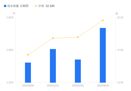 8月27日消息,数据显示,截至2025年6月30日,南凌科技A股股东总户数为2.55万户,较上期(2025年3月31日)增加7782户,增幅43.99%。公司最新A股总股本为1.84亿股,其中流通A股1.15亿股,户均持有流通A股数量为4503.2股,较上期减少151.51股,降幅3.25%;户均持流通A股市值9.95万元,较上期增加8800.41元,增幅9.70%。
