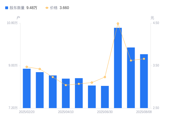 近一年(2024年6月30日至2025年6月30日),拓日新能A股股东户数从9.42万户,减低至8.14万户,降幅13.56%,区间股价上涨14.54%。