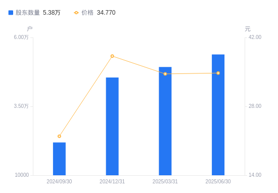 8月27日消息,数据显示,截至2025年6月30日,博士眼镜A股股东总户数为5.38万户,较上期(2025年3月31日)增加4558户,增幅9.25%。公司最新A股总股本为2.28亿股,其中流通A股1.55亿股,户均持有流通A股数量为2873.09股,较上期增加458.65股,增幅19.00%;户均持流通A股市值9.99万元,较上期增加1.64万元,增幅19.58%。