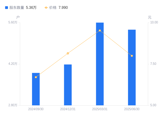 8月27日消息,数据显示,截至2025年6月30日,慈星股份(维权)A股股东总户数为5.36万户,较上期(2025年3月31日)减少2401户,降幅4.29%。公司最新A股总股本为7.94亿股,其中流通A股7.82亿股,户均持有流通A股数量为1.46万股,较上期增加626.21股,增幅4.48%;户均持流通A股市值11.67万元,较上期减少1.64万元,降幅12.31%。
