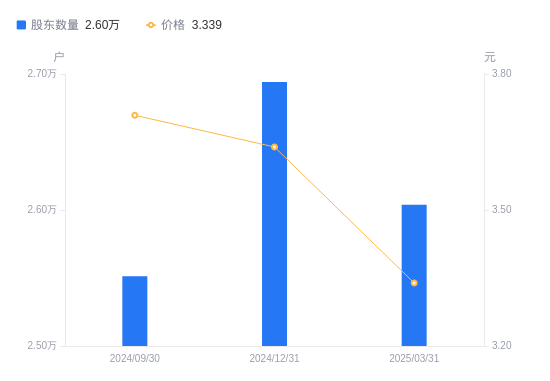 8月27日消息,数据显示,截至2025年6月30日,轻纺城A股股东总户数为2.77万户,较上期(2025年3月31日)增加1622户,增幅6.23%。公司最新A股总股本为14.66亿股,其中流通A股14.66亿股,户均持有流通A股数量为5.3万股,较上期减少3301.13股,降幅5.86%;户均持流通A股市值19.77万元,较上期增加9697.84元,增幅5.16%。