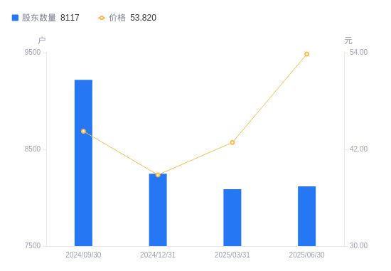 近一年(2024年6月30日至2025年6月30日),多浦乐A股股东户数从9224户,减低至8117户,降幅12.00%,区间股价上涨26.11%。
