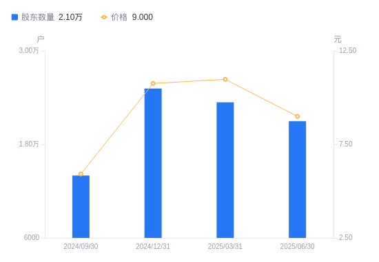 8月27日消息,数据显示,截至2025年6月30日,瑞凌股份A股股东总户数为2.1万户,较上期(2025年3月31日)减少2427户,降幅10.37%。公司最新A股总股本为4.5亿股,其中流通A股3.15亿股,户均持有流通A股数量为1.5万股,较上期增加1559.98股,增幅11.57%;户均持流通A股市值13.53万元,较上期减少1.26万元,降幅8.55%。