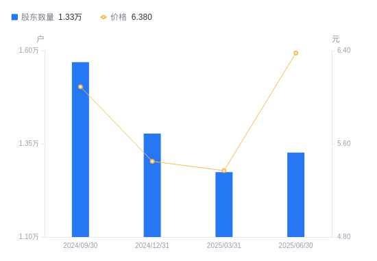 近一年(2024年6月30日至2025年6月30日),裕兴股份A股股东户数从1.56万户,减低至1.33万户,降幅14.84%,区间股价上涨8.21%。