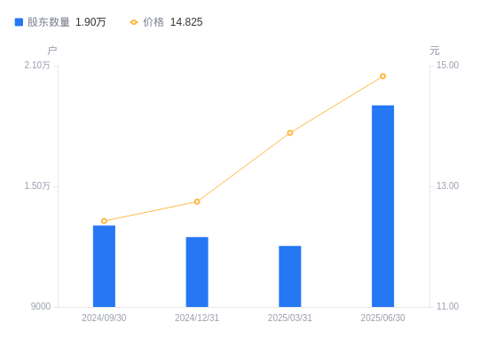 8月27日消息,数据显示,截至2025年6月30日,永冠新材A股股东总户数为1.9万户,较上期(2025年3月31日)增加6986户,增幅58.04%。公司最新A股总股本为1.91亿股,其中流通A股1.91亿股,户均持有流通A股数量为1万股,较上期减少5832.05股,降幅36.73%;户均持流通A股市值14.9万元,较上期减少7.15万元,降幅32.44%。