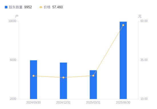 近一年(2024年6月30日至2025年6月30日),霍普股份A股股东户数从6074户,增加至9952户,增幅63.85%,区间股价上涨189.62%。