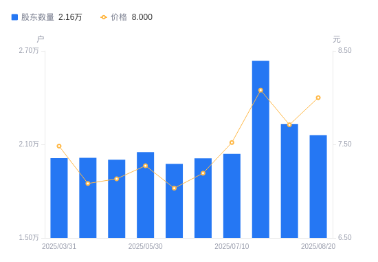 近一年(2024年8月20日至2025年8月20日),中新集团A股股东户数从2.04万户,增加至2.16万户,增幅5.75%,区间股价上涨6.92%。