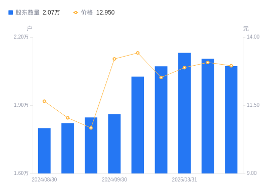 近一年(2024年8月20日至2025年8月20日),元祖股份A股股东户数从1.84万户,增加至2.07万户,增幅12.72%,区间股价下跌0.38%。