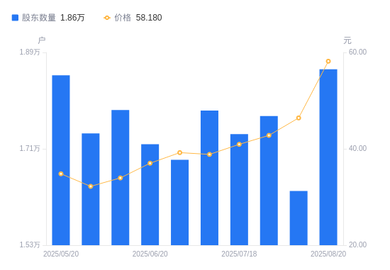近一年(2024年8月20日至2025年8月20日),威尔高A股股东户数从1.65万户,增加至1.86万户,增幅12.94%,区间股价上涨104.60%。