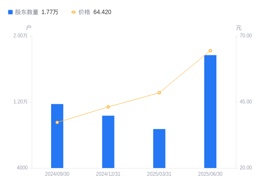 8月28日消息,数据显示,截至2025年6月30日,观想科技A股股东总户数为1.77万户,较上期(2025年3月31日)增加8946户,增幅102.54%。公司最新A股总股本为8000万股,其中流通A股5171.1万股,户均持有流通A股数量为2926.49股,较上期减少3000.96股,降幅50.63%;户均持流通A股市值18.85万元,较上期减少9.89万元,降幅34.41%。