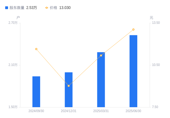 8月28日消息,数据显示,截至2025年6月30日,震安科技A股股东总户数为2.53万户,较上期(2025年3月31日)增加2428户,增幅10.64%。公司最新A股总股本为2.76亿股,其中流通A股2.4亿股,户均持有流通A股数量为9489.96股,较上期减少1009.27股,降幅9.61%;户均持流通A股市值12.37万元,较上期增加6272.79元,增幅5.34%。