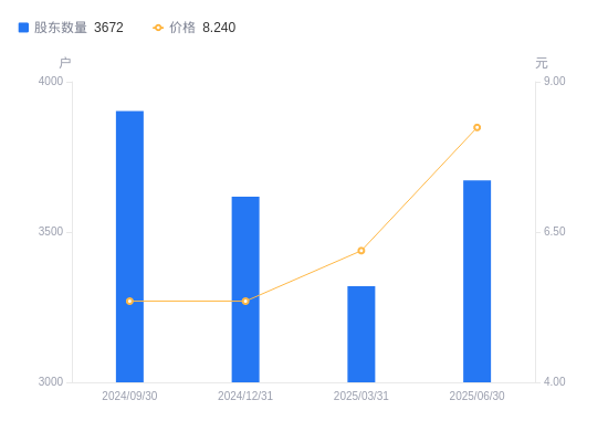 8月28日消息,数据显示,截至2025年6月30日,卓锦股份(维权)A股股东总户数为3672户,较上期(2025年3月31日)增加352户,增幅10.60%。公司最新A股总股本为1.34亿股,其中流通A股1.34亿股,户均持有流通A股数量为3.66万股,较上期减少3877.08股,降幅9.59%;户均持流通A股市值30.13万元,较上期增加5.1万元,增幅20.36%。