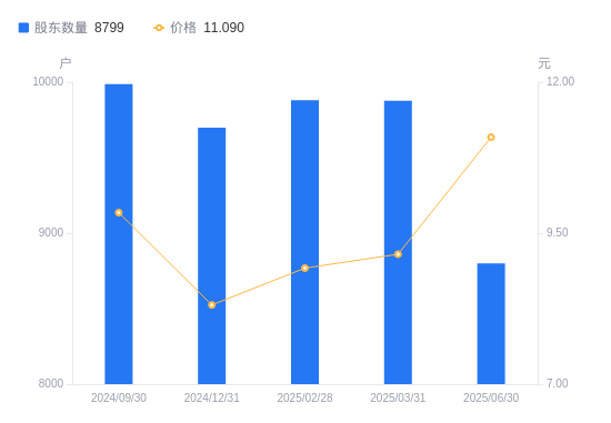 近一年(2024年6月30日至2025年6月30日),海波重科A股股东户数从9030户,减低至8799户,降幅2.56%,区间股价上涨31.24%。