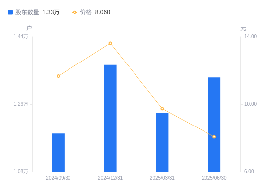 近一年(2024年6月30日至2025年6月30日),*ST熊猫A股股东户数从1.22万户,增加至1.33万户,增幅9.01%,区间股价下跌3.47%。