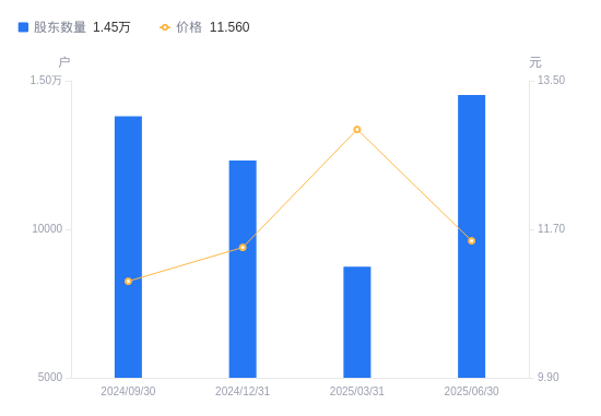 近一年(2024年6月30日至2025年6月30日),联合水务A股股东户数从1.33万户,增加至1.45万户,增幅9.03%,区间股价下跌4.27%。