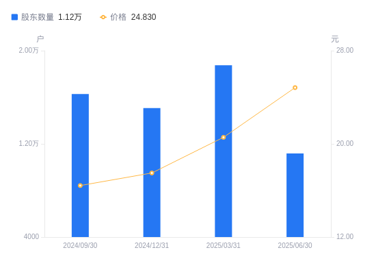 8月28日消息,数据显示,截至2025年6月30日,力鼎光电A股股东总户数为1.12万户,较上期(2025年3月31日)减少7572户,降幅40.38%。公司最新A股总股本为4.11亿股,其中流通A股4.07亿股,户均持有流通A股数量为3.64万股,较上期增加1.47万股,增幅67.73%;户均持流通A股市值90.42万元,较上期增加45.78万元,增幅102.56%。