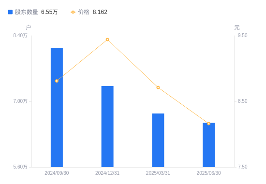 8月28日消息,数据显示,截至2025年6月30日,龙头股份A股股东总户数为6.55万户,较上期(2025年3月31日)减少1978户,降幅2.93%。公司最新A股总股本为4.25亿股,其中流通A股4.25亿股,户均持有流通A股数量为6491.19股,较上期增加190.41股,增幅3.02%;户均持流通A股市值5.3万元,较上期减少1911.27元,降幅3.48%。