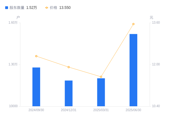 8月28日消息,数据显示,截至2025年6月30日,海利尔A股股东总户数为1.52万户,较上期(2025年3月31日)增加3185户,增幅26.53%。公司最新A股总股本为3.4亿股,其中流通A股3.4亿股,户均持有流通A股数量为2.24万股,较上期减少5935.38股,降幅20.97%;户均持流通A股市值30.32万元,较上期减少2.32万元,降幅7.12%。