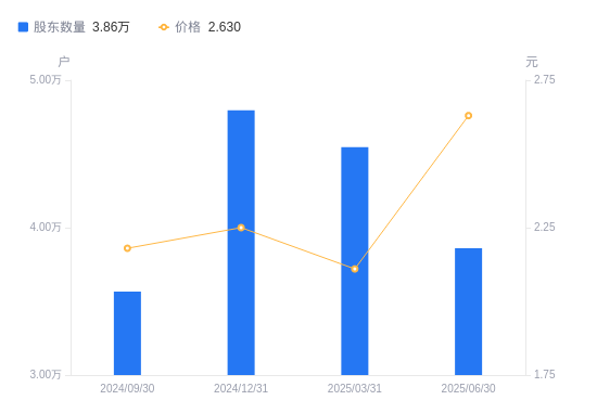 8月28日消息,数据显示,截至2025年6月30日,勤上股份A股股东总户数为3.86万户,较上期(2025年3月31日)减少6861户,降幅15.09%。公司最新A股总股本为14.37亿股,其中流通A股13.47亿股,户均持有流通A股数量为3.49万股,较上期增加5266.05股,增幅17.77%;户均持流通A股市值9.18万元,较上期增加2.93万元,增幅46.80%。