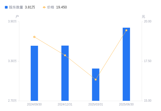 近一年(2024年6月30日至2025年6月30日),安达维尔A股股东户数从3.76万户,增加至3.81万户,增幅1.14%,区间股价上涨15.02%。