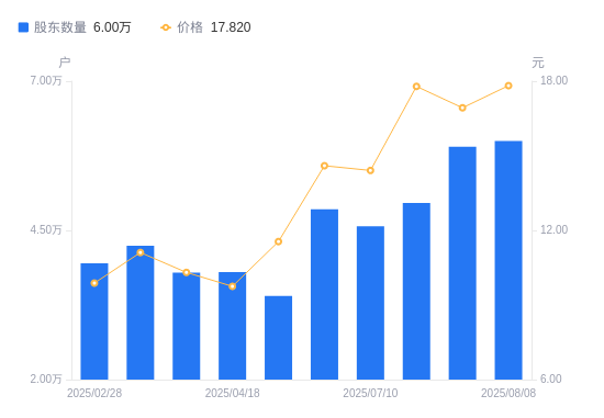 近一年(2024年6月30日至2025年6月30日),北化股份A股股东户数从4.66万户,增加至4.85万户,增幅4.14%,区间股价上涨75.48%。