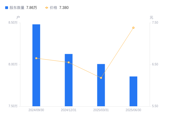 8月28日消息,数据显示,截至2025年6月30日,盛路通信A股股东总户数为7.86万户,较上期(2025年3月31日)减少1487户,降幅1.86%。公司最新A股总股本为9.15亿股,其中流通A股8.48亿股,户均持有流通A股数量为1.08万股,较上期增加200.4股,增幅1.89%;户均持流通A股市值7.96万元,较上期增加1.42万元,增幅21.68%。