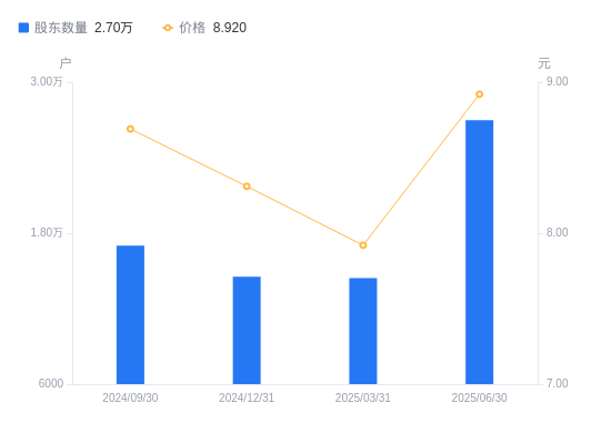 近一年(2024年6月30日至2025年6月30日),时代出版A股股东户数从1.71万户,增加至2.7万户,增幅57.88%,区间股价上涨33.53%。