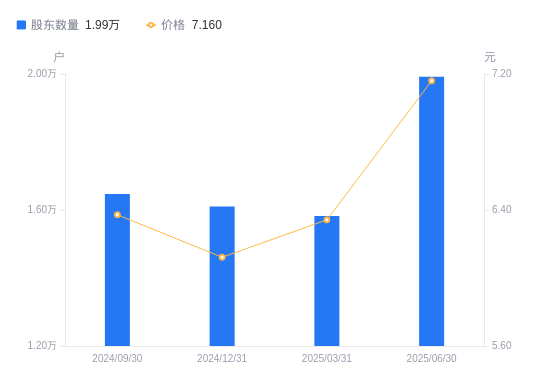 8月28日消息,数据显示,截至2025年6月30日,永东股份A股股东总户数为1.99万户,较上期(2025年3月31日)增加4096户,增幅25.89%。公司最新A股总股本为3.76亿股,其中流通A股2.43亿股,户均持有流通A股数量为1.22万股,较上期减少3155.6股,降幅20.56%;户均持流通A股市值8.73万元,较上期减少1万元,降幅10.32%。