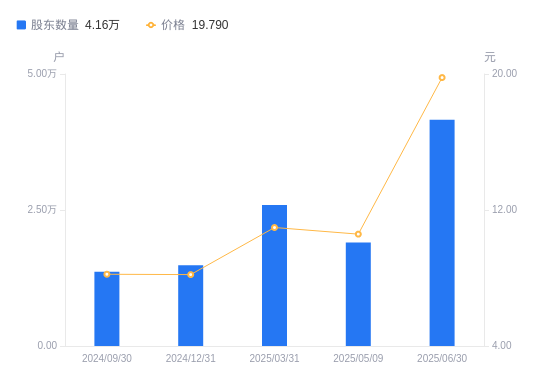 近一年(2024年6月30日至2025年6月30日),兴业股份A股股东户数从1.53万户,增加至4.16万户,增幅171.17%,区间股价上涨156.68%。