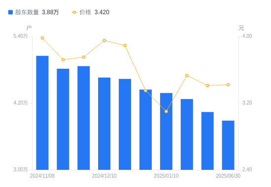 近一年(2024年6月30日至2025年6月30日),华控赛格A股股东户数从4.14万户,减低至3.88万户,降幅6.21%,区间股价上涨26.67%。