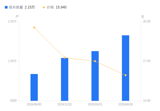 近一年(2024年6月30日至2025年6月30日),凌霄泵业A股股东户数从1.09万户,增加至2.15万户,增幅97.45%,区间股价下跌12.42%。