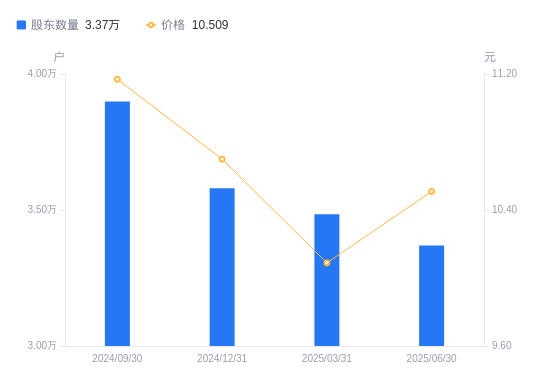 近一年(2024年6月30日至2025年6月30日),沧州大化A股股东户数从4.03万户,减低至3.37万户,降幅16.35%,区间股价上涨3.96%。