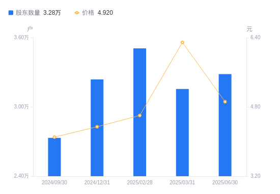 8月29日消息,数据显示,截至2025年6月30日,福成股份A股股东总户数为3.28万户,较上期(2025年3月31日)增加1292户,增幅4.10%。公司最新A股总股本为8.19亿股,其中流通A股8.19亿股,户均持有流通A股数量为2.49万股,较上期减少1020.84股,降幅3.93%;户均持流通A股市值12.26万元,较上期减少4.06万元,降幅24.88%。