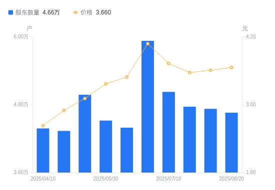 近一年(2024年6月30日至2025年6月30日),新能泰山A股股东户数从4.43万户,减低至4.39万户,降幅0.90%,区间股价上涨44.81%。
