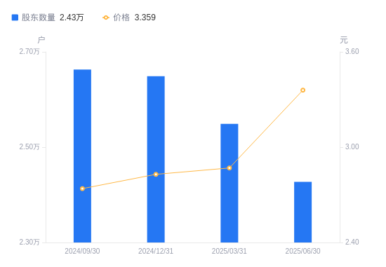 近一年(2024年6月30日至2025年6月30日),合兴包装A股股东户数从2.7万户,减低至2.43万户,降幅10.03%,区间股价上涨54.86%。