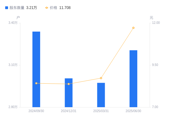 8月29日消息,数据显示,截至2025年6月30日,尖峰集团A股股东总户数为3.21万户,较上期(2025年3月31日)增加2322户,增幅7.81%。公司最新A股总股本为3.44亿股,其中流通A股3.44亿股,户均持有流通A股数量为1.07万股,较上期减少838.23股,降幅7.24%;户均持流通A股市值12.57万元,较上期增加2.47万元,增幅24.47%。