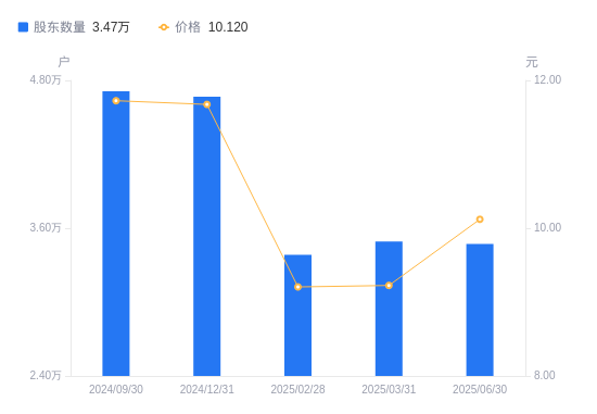 8月29日消息,数据显示,截至2025年6月30日,香溢融通A股股东总户数为3.47万户,较上期(2025年3月31日)减少191户,降幅0.55%。公司最新A股总股本为4.54亿股,其中流通A股4.54亿股,户均持有流通A股数量为1.31万股,较上期增加71.55股,增幅0.55%;户均持流通A股市值13.24万元,较上期增加1.24万元,增幅10.31%。