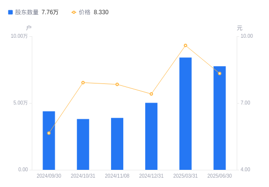 近一年(2024年6月30日至2025年6月30日),盛通股份A股股东户数从4.58万户,增加至7.76万户,增幅69.52%,区间股价上涨67.27%。