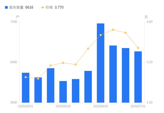 近一年(2024年6月30日至2025年6月30日),ST雪发A股股东户数从6169户,增加至6733户,增幅9.14%,区间股价上涨53.24%。