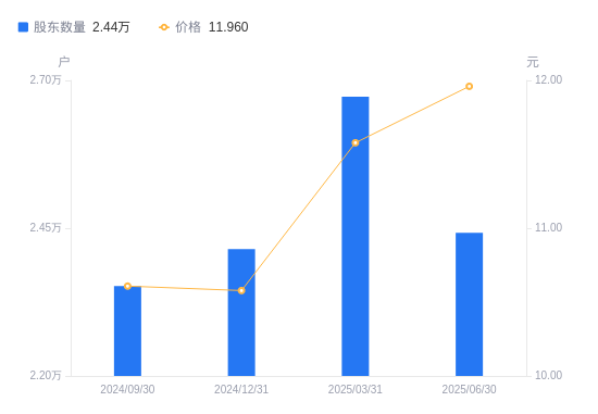 8月29日消息,数据显示,截至2025年6月30日,音飞储存A股股东总户数为2.44万户,较上期(2025年3月31日)减少2305户,降幅8.62%。公司最新A股总股本为2.94亿股,其中流通A股2.94亿股,户均持有流通A股数量为1.2万股,较上期增加1039.01股,增幅9.44%;户均持流通A股市值14.41万元,较上期增加1.66万元,增幅13.05%。