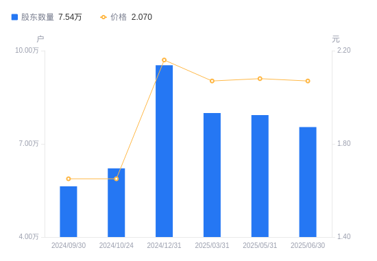 近一年(2024年6月30日至2025年6月30日),江南高纤A股股东户数从5.74万户,增加至7.54万户,增幅31.41%,区间股价上涨48.92%。