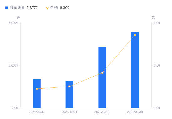 8月29日消息,数据显示,截至2025年6月30日,海洋王A股股东总户数为5.37万户,较上期(2025年3月31日)增加1.04万户,增幅24.04%。公司最新A股总股本为7.71亿股,其中流通A股5.72亿股,户均持有流通A股数量为1.07万股,较上期减少2561.08股,降幅19.38%;户均持流通A股市值8.84万元,较上期增加8081.27元,增幅10.06%。